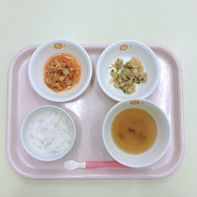 今日の給食は、ハッシュドビーフ、小松菜と人参のコンソメスープ、スパゲティサラダ、ラフランスゼリーです。