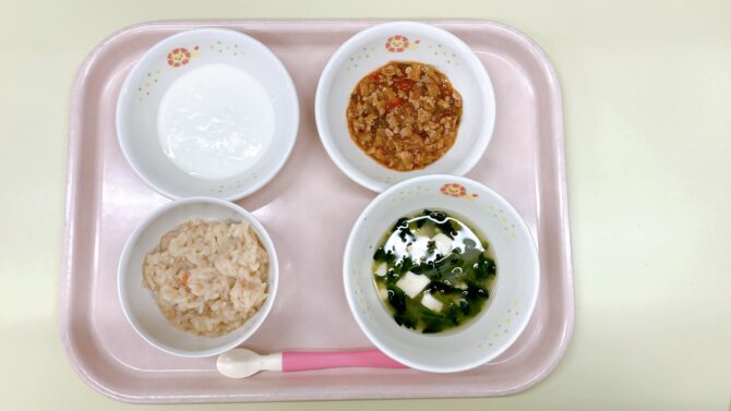 今日の給食は、野沢菜チャーハン、ワンタンスープ、キャベツの五色和え、バナナです。