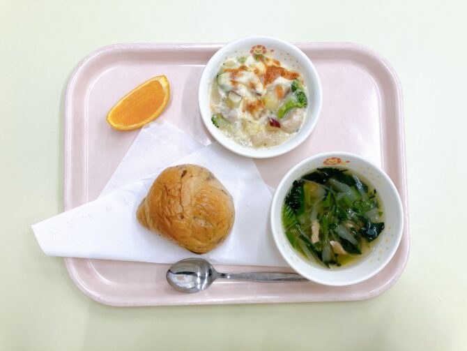 今日の給食は、カレーうどん、牛乳、もやしとブロッコリーの塩昆布和え、バナナです。