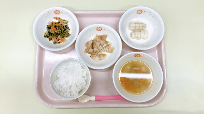 今日の給食は、根菜カレー、牛乳、海藻サラダ、バナナです。