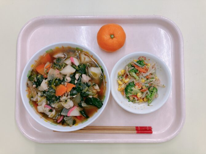 今日の給食は、ごはん、大根と油揚げの味噌汁、マグロの竜田揚げ、磯香和え、オレンジです。