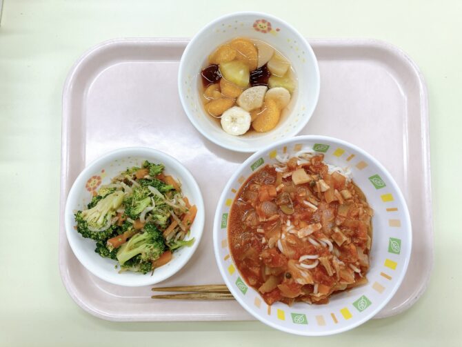 今日の給食は、ちゃんぽん風ラーメン、レンコンとしらすの和風サラダ、フルーツヨーグルトです。