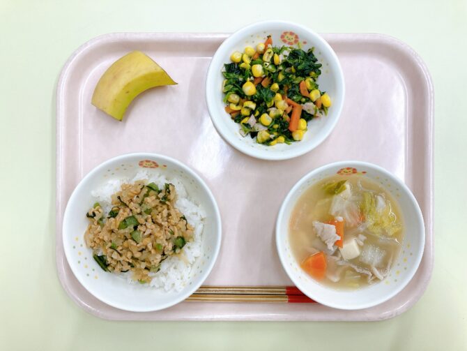 今日の給食は、ごはん、けんちん汁、鯵の香味揚げ、おかかポン酢和え、バナナです。