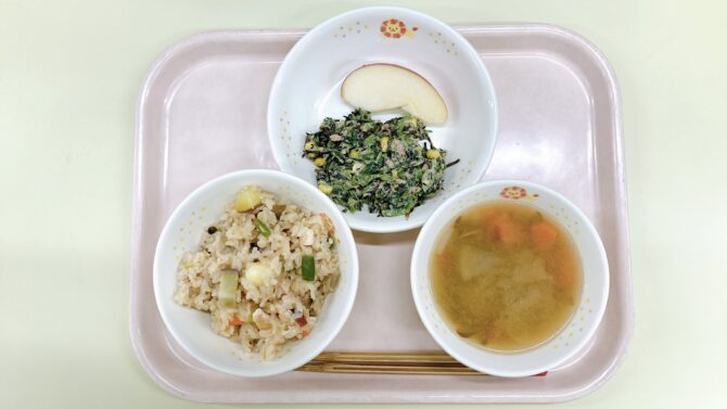 今日の給食は、アップルパン、ポークビーンズ、コールスローサラダ、ヨーグルトです。
