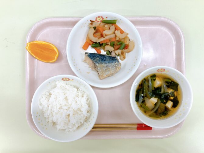 (めばえ組・ひかり組)今日の給食は、とりツナそぼろ丼、小松菜のスープ、フルーツサラダです。