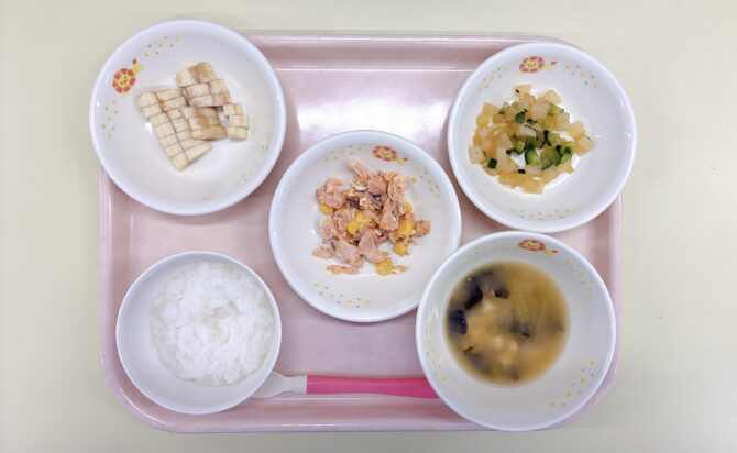 今日の給食は、デニッシュロール、サーモンシチュー、パインサラダです。