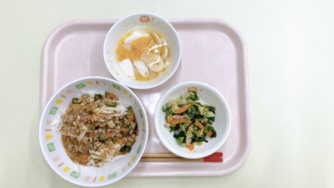 今日の給食は、ジャージャースパゲティ、白菜と小松菜のおかか和え、フルーツ杏仁です。