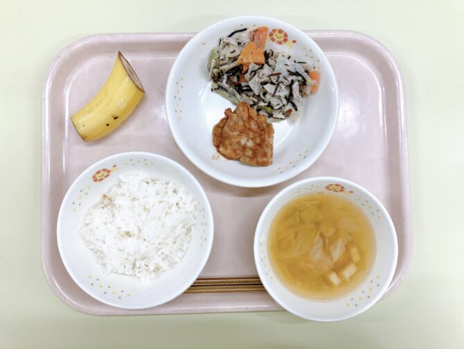 今日の給食は、ごはん、麩の味噌汁、鶏肉のバーベキューソース、レンコンとひじきのサラダ、バナナです。