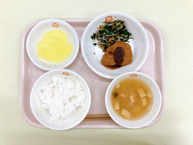 今日の給食は、ごはん、しめじと玉ねぎの味噌汁、かぼちゃひき肉フライ、もやしとほうれん草の塩昆布和え、カットゼリー(レモン)です。
