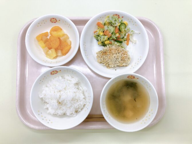 今日の給食は、ごはん、玉ねぎと生揚げの味噌汁、鶏肉の香草焼き、ブロッコリーとキャベツのサラダ、フルーツミックスです。